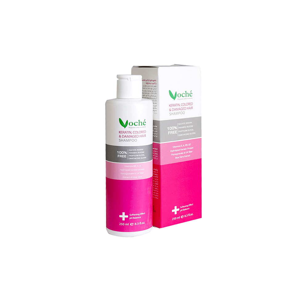 ویژگی های شامپو کراتين موهاي رنگ شده و آسيب ديده Keratin, Colored & Damaged Hair Shampoo برند Voche حجم 250ml: