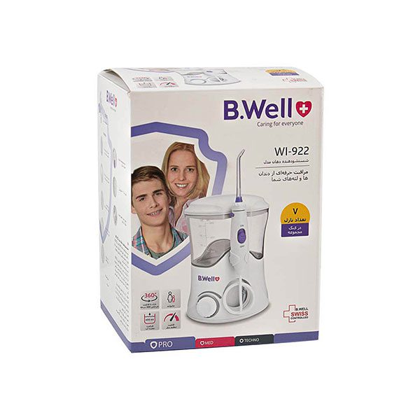 B.Well در سال 2004 میلادی توسط گروهی از پزشکان مقیم لندن تاسیس شد و در مدت زمان کوتاهی توانست اعتماد بسیاری از کاربران را به دست آورد. دستگاه شست و شوی دهان و دندان بی ول مدل WI-922 با قابلیت تمیز کردن قوی به حفظ سلامتی دندان، زبان و لثههای شما کمک میکند. این شستشو دهنده با بکارگیری ترکیبی از جریان پرفشار و جهندهی آب به از بین بردن باکتریهای مضر از نواحی عمیق بین دندانی و زیر خط لثه که نمیتوان با مسواک به آنها دسترسی پیدا کرد، کمک میکند. این دستگاه دارای هفت نازل برای تمامی نیازهای مصرفکننده است که این هفت نازل عبارتاند از: 3 نازل استاندارد برای مراقبت از دهان، نازل تمیزکننده زبان، نازل ارتودنسی(برای براکتهای دندانها)، نازل برای ایمپلنت(پل، تاج و روکش دندان) و نازل پریودنتال(برای لثهها). این دستگاه دارای پایهی ثابت بدون لغزش، نازل با قابلیت چرخش 360 درجه، نگهدارندهی مناسب برای دستهی دستگاه و یک کلید پیچشی کنترل برای تنظیم میزان شدت عملکرد دستگاه در ده حالت مختلف است