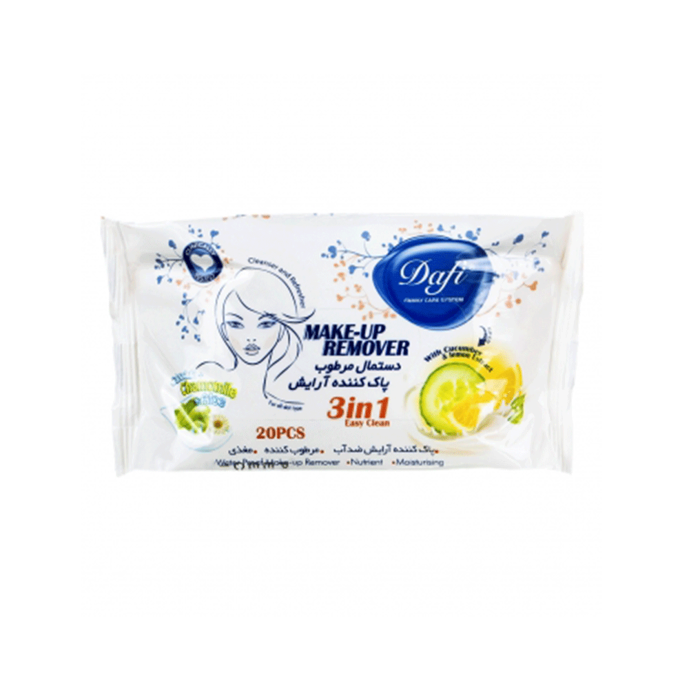 ویژگی های دستمال مرطوب پاک کننده 3 در 1 آرايش Make-Up Remover 3in1 از برند Dafi در بسته بندی 20 عددی: