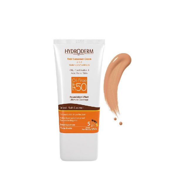 ویژگی های کرم ضد آفتاب رنگی SPF 50 فاقد چربی کاراملی 2 در 1 مناسب پوست چرب Sunblock 2*1 SPF50 OilySkin Caramel برند Hydroderm حجم 40 میل:
