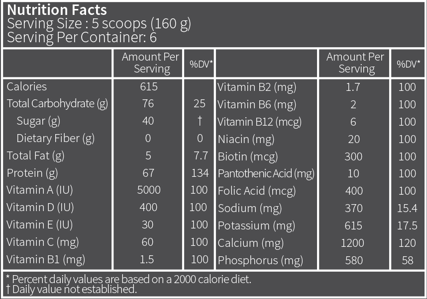 12 نوع ويتامين تامين كننده 100 % نياز بدن, 42 % پروتئين شامل مخلوطی از پروتئین های whey و شیر |